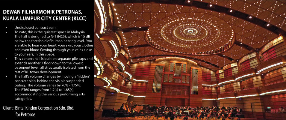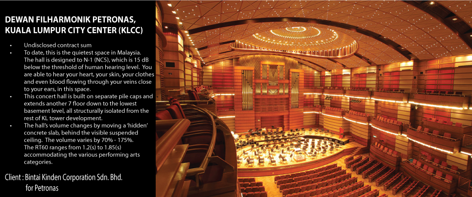 - within the Petronas KLCC Philharmonic Concert Hall (achieved noise criteria N-1 or NC5) which is approx. 15dBA below the threshold of human ear listening level. This space till date is the quietest acoustic public environmrent in Asia.