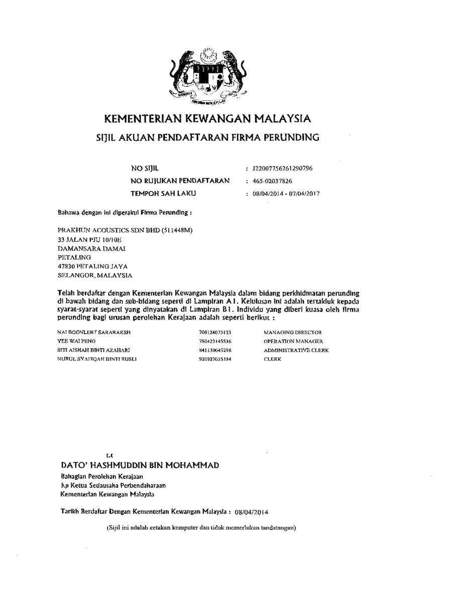 Prakhun Acoustics Sdn Bhd is a registered company in Malaysia with Bumiputera majority share holding, providing Professional acoustic consulting services to architects, engineers, suppliers, contractors and industries throughout Asia, specialising in all areas of acoustics conditioning, noise and vibration control and Professional audio visual consulting services to architects, engineers, suppliers, contractors and industries throughout Asia, specialising in all areas of electro-acoustic design such as sound reinforcement, video/data projection, specialist lighting and rigging system, various interpretation and communication systems, audio-video conferencing and many other audio and visual related fields.